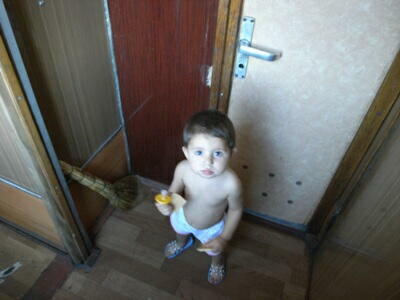 お母さんはトイレにいる。彼女は扉を何度も叩いた。
