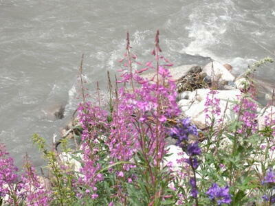 川に沿ったり見下ろしたり。針葉樹林が生い茂る。