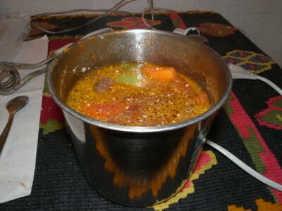 炊。携行している電熱コイルと特大ブリキコップで、人参ピーマントマト干し
